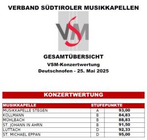Am 25. Mai 2025 haben 6 Südtiroler Musikkapellen an der Konzertwertung in Deutschofen teilgenommen und sowohl Publikum wie Jury mit toller Musik beeindruckt.