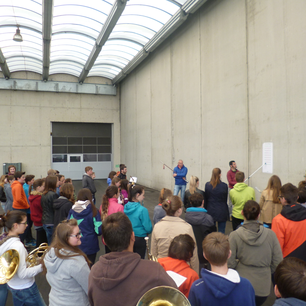 Nach einer kurzen Pause teilte sich die Gruppe in Bläser und Schlagzeuger um getrennt das richtige An- und Absetzen der Instrumente bzw. das Einschlagen eines Marsches zu erlernen. Nach getrenntem „Trockentraining“ wurden die einzelnen Bausteine zusammengefügt und das gesamte im Marschblock und in Bewegung trainiert. Dank Unterstützung durch die Jungenleiter und anderen Begleitern konnte das Erlernte sogar im Spiel mit dem Marsch „Schloss Leutenburg“ geübt werden. Bis zur Schwierigkeitsstufe B, worin sogar das vorzeitige Beenden eines Marsches und das Halten- und Abmarschieren während dem Spiel enthalten ist, wurde mit den Jugendlichen erlernt.
