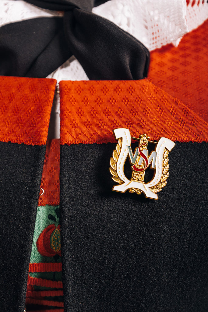 Abzeichen vorsichtig ans Mieder stecken, damit der Stoff oder die Samtbänder nicht beschädigt werden!