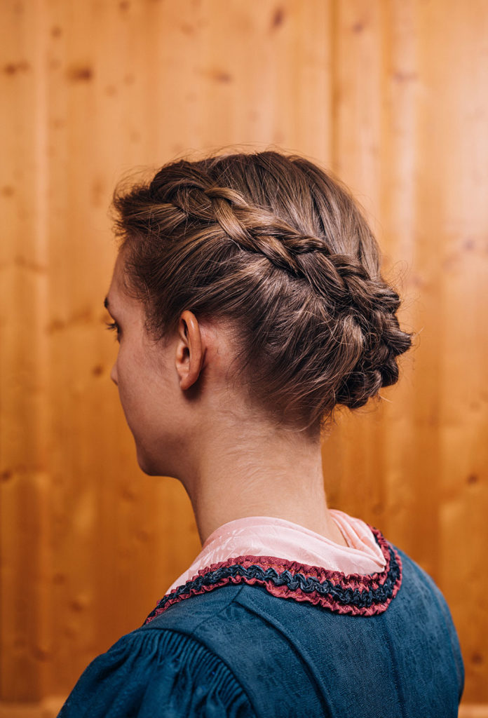 Lange Haare gehören aufgesteckt oder eingezopft. Sie dürfen nicht ins Gesicht fallen und auch nicht den Rücken hinunterhängen, da sie sonst den schönsten Teil der Tracht – das Mieder und die Spitzen – verdecken.