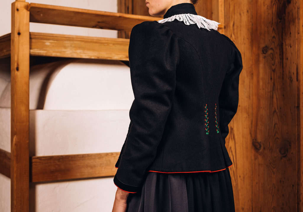 Die Tüchltracht wird im Winter mit den langen, wollenen Schinkenärmeln und im Sommer mit den kurzen, weißen Baumwollärmeln mit Spitze getragen.