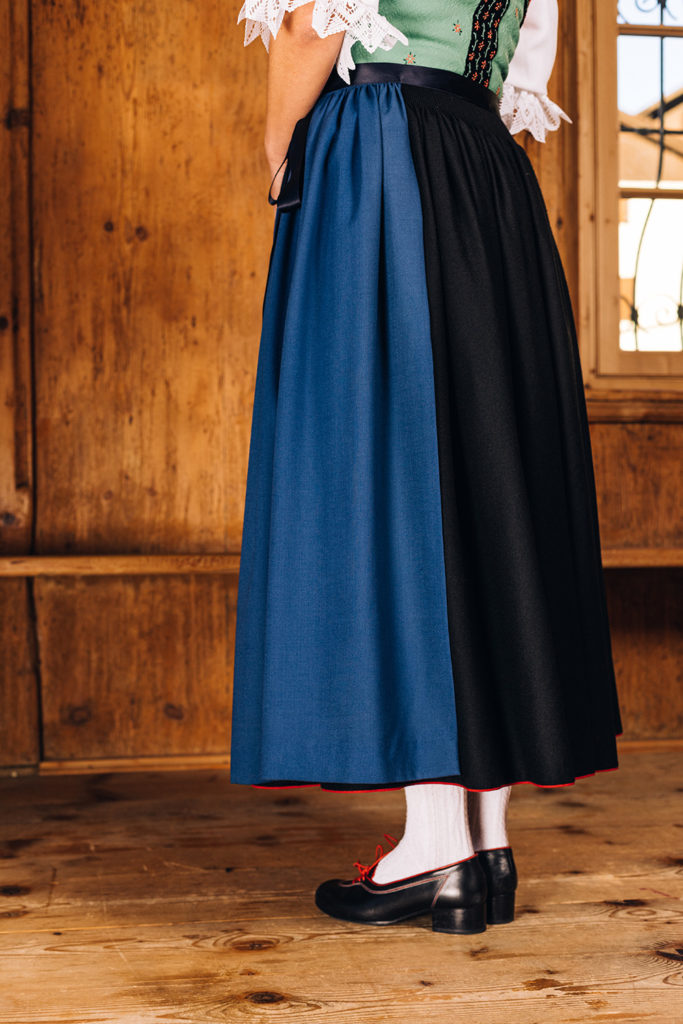 Der Rock kann gezogen oder plissiert sein. Er muss die richtige Länge – eine Spanne vom Boden entfernt – und das entsprechende farbige Beleg aufweisen. Wichtig ist ein ordentlicher Kittelsack.