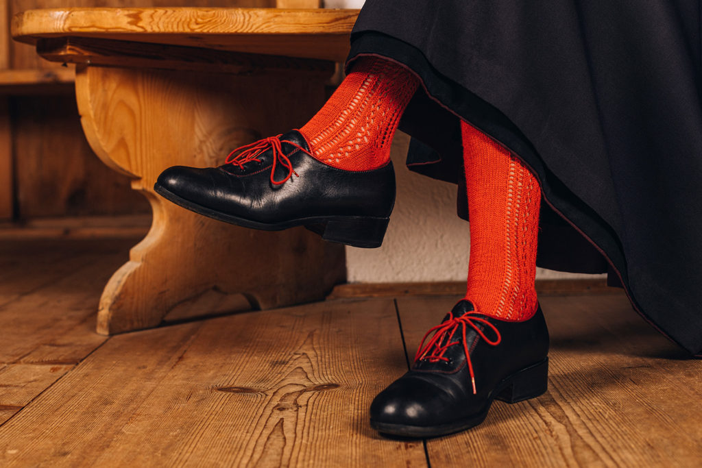 Zur Tüchltracht werden schwarze Seidenstrümpfe getragen.