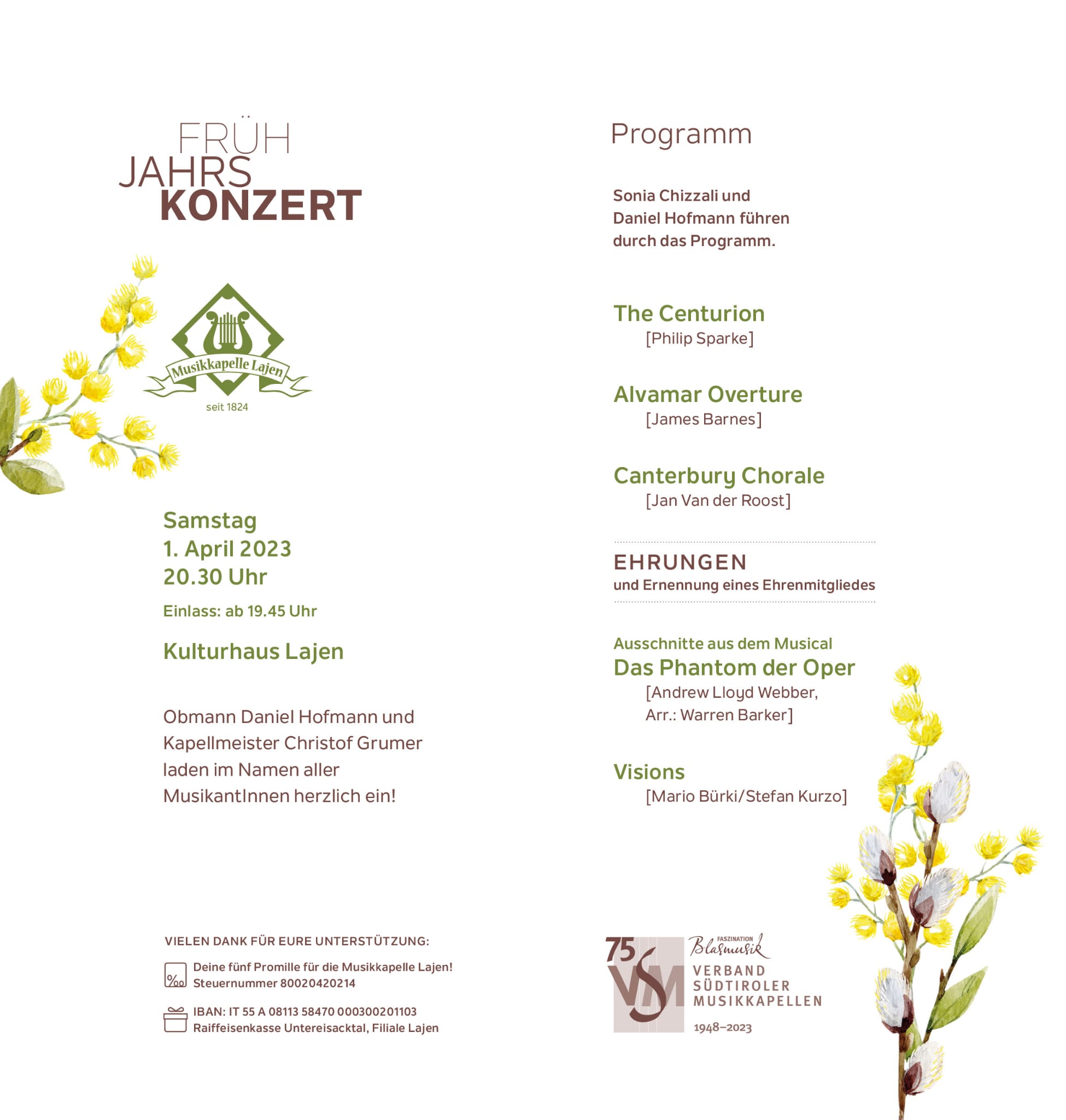 Die Musikkapelle Lajen lädt Sie herzlich zum Frühjahrskonzert am Samstag, 01. April 2023 um 20.30 Uhr im Kulturhaus von Lajen ein.