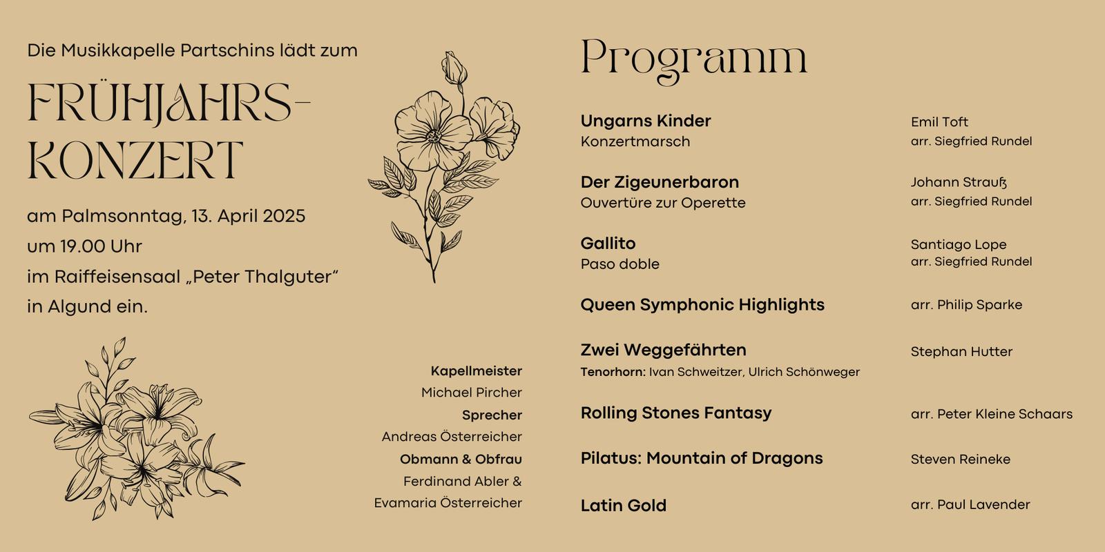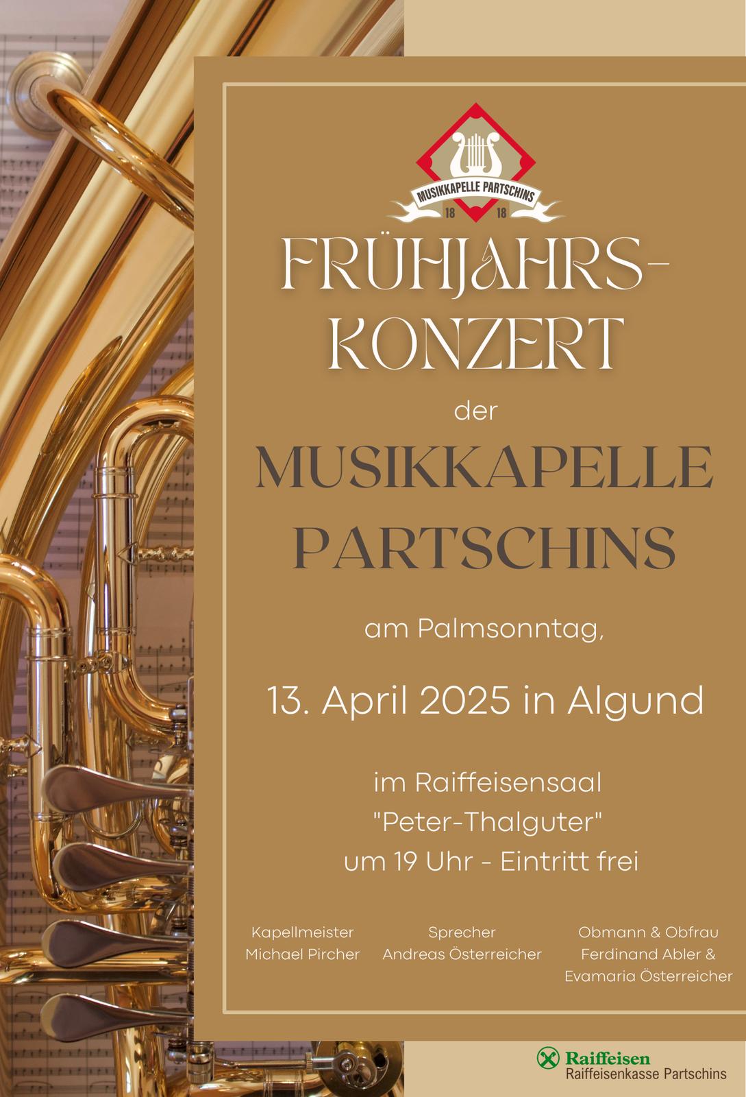 Wir laden herzlich zum Frühjahrskonzert am Sonntag, den 13. April 2025 mit Beginn um 19.00 Uhr im Thalguterhaus von Algund ein. Wir freuen uns auf Euer Kommen.