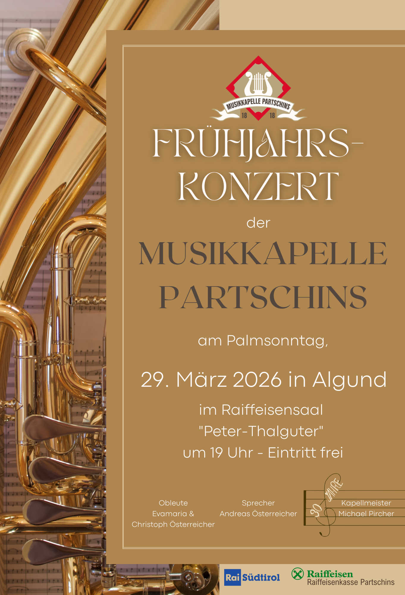 Die Musikkapelle Partschins lädt Sie herzlichst zum Frühjahrskonzert am 29. März 2026 um 19.00 Uhr im Peter Thalguter Haus von Algund ein. In diesem Jahr erwartet Sie neben einem abwechslungsreichen Programm die Uraufführung unserer Auftragskomposition “Klang der Treue”, welche von Christoph Österreicher anlässlich des 30-jährigen Kapellmeister-Jubiläums von Michael Pircher geschrieben wurde.