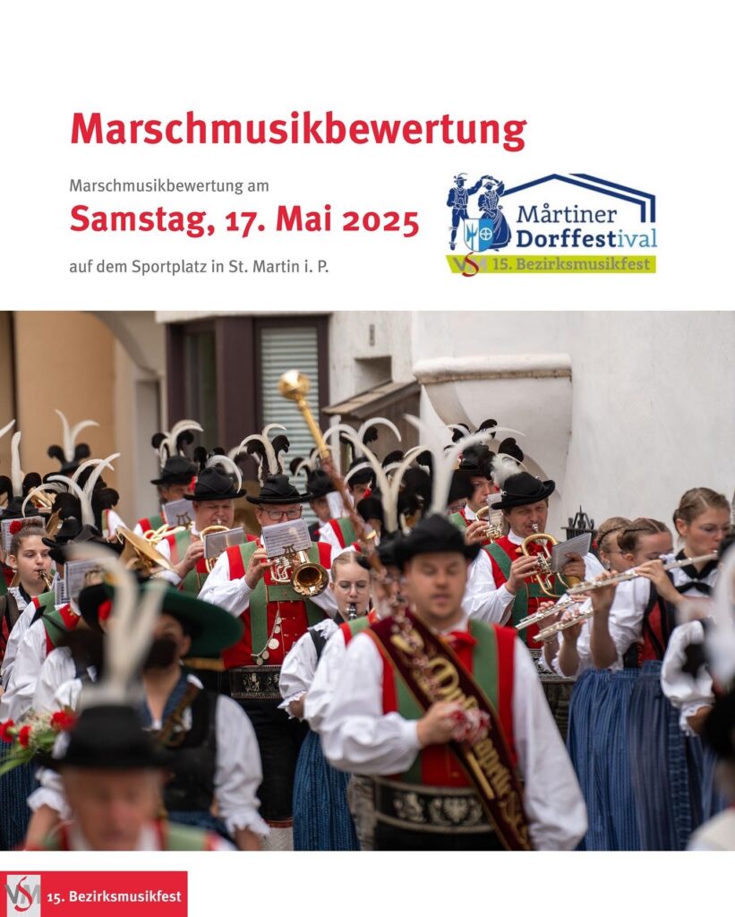 15. VSM-Bezirksmusikfest 2025 - Marschmusikbewertung Am Samstag, 17. Mai auf dem Sportplatz in St. Martin i.P. Eröffnung um 12.30 Uhr...